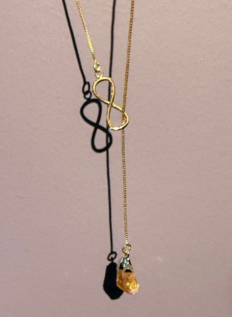 Ilgis ~32 cm, citrino drūzos su cinkuoto žalvario apvadu (aukso spalvos) dydis 2 cm.